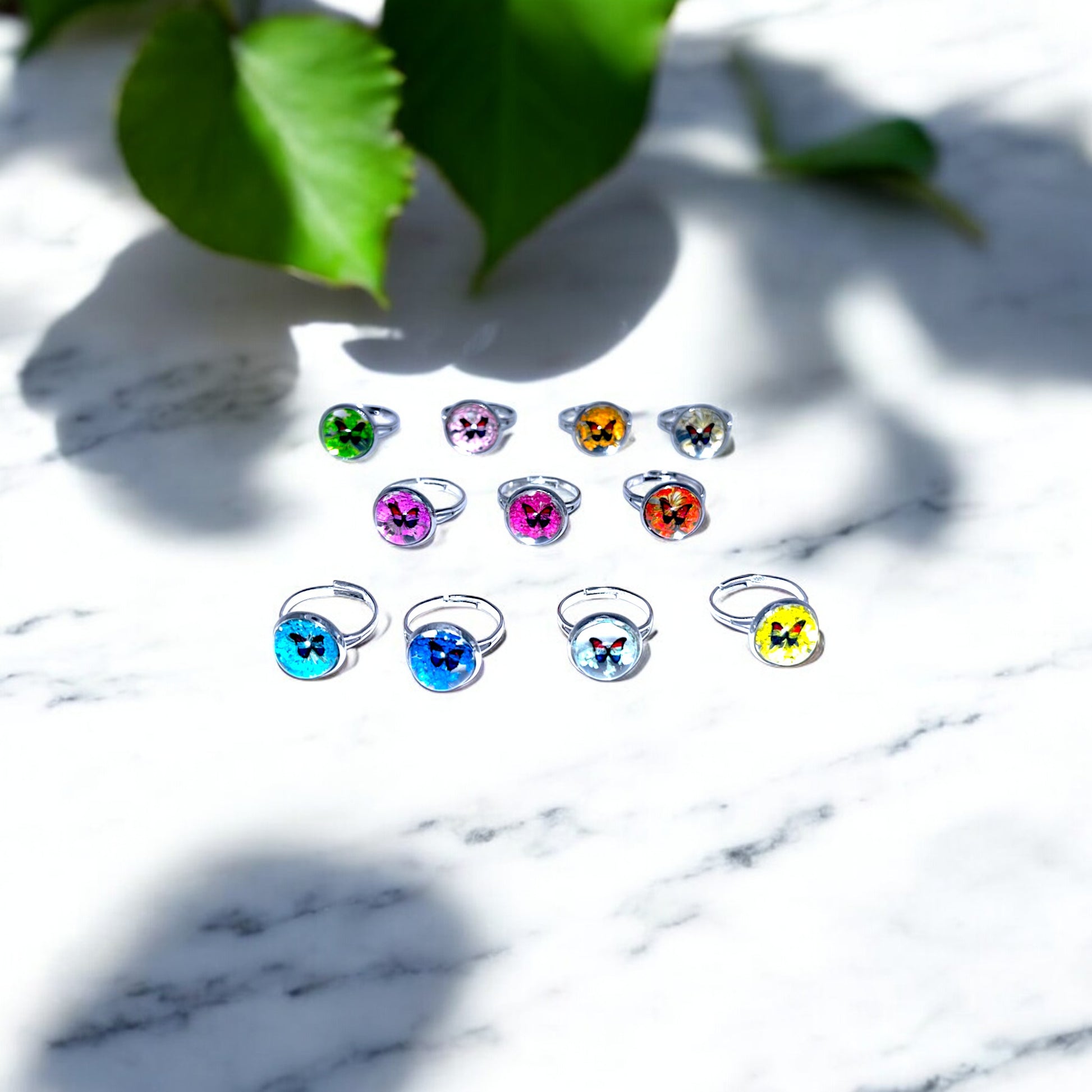 Add a splash of color and a touch of nature to your style with these handcrafted butterfly resin rings. Each ring features a vivid round resin dome encasing a delicate butterfly design set against a background of bright, cheerful colors—reminiscent of a blooming garden in spring. The high-gloss resin finish enhances the vibrant hues and gives each piece a crystal-clear, glass-like appearance. These rings are both lightweight and eye-catching, perfect for everyday wear or as a charming statement piece.
