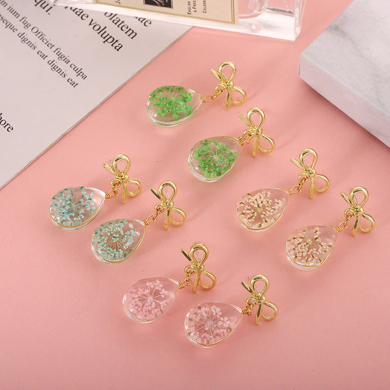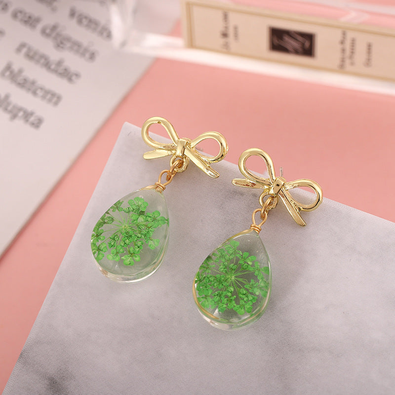 ring timeless charm to your accessory collection with these elegant teardrop floral resin earrings. Each piece showcases a delicate dried flower encased in a clear resin teardrop, perfectly paired with a gold-tone bow charm for an extra touch of sophistication. Available in soft pastel hues like green, blue, pink, and white, these earrings are lightweight and versatile, ideal for both casual and formal occasions. Elevate your style with these graceful handmade earrings that capture the beauty of nature in every detail.