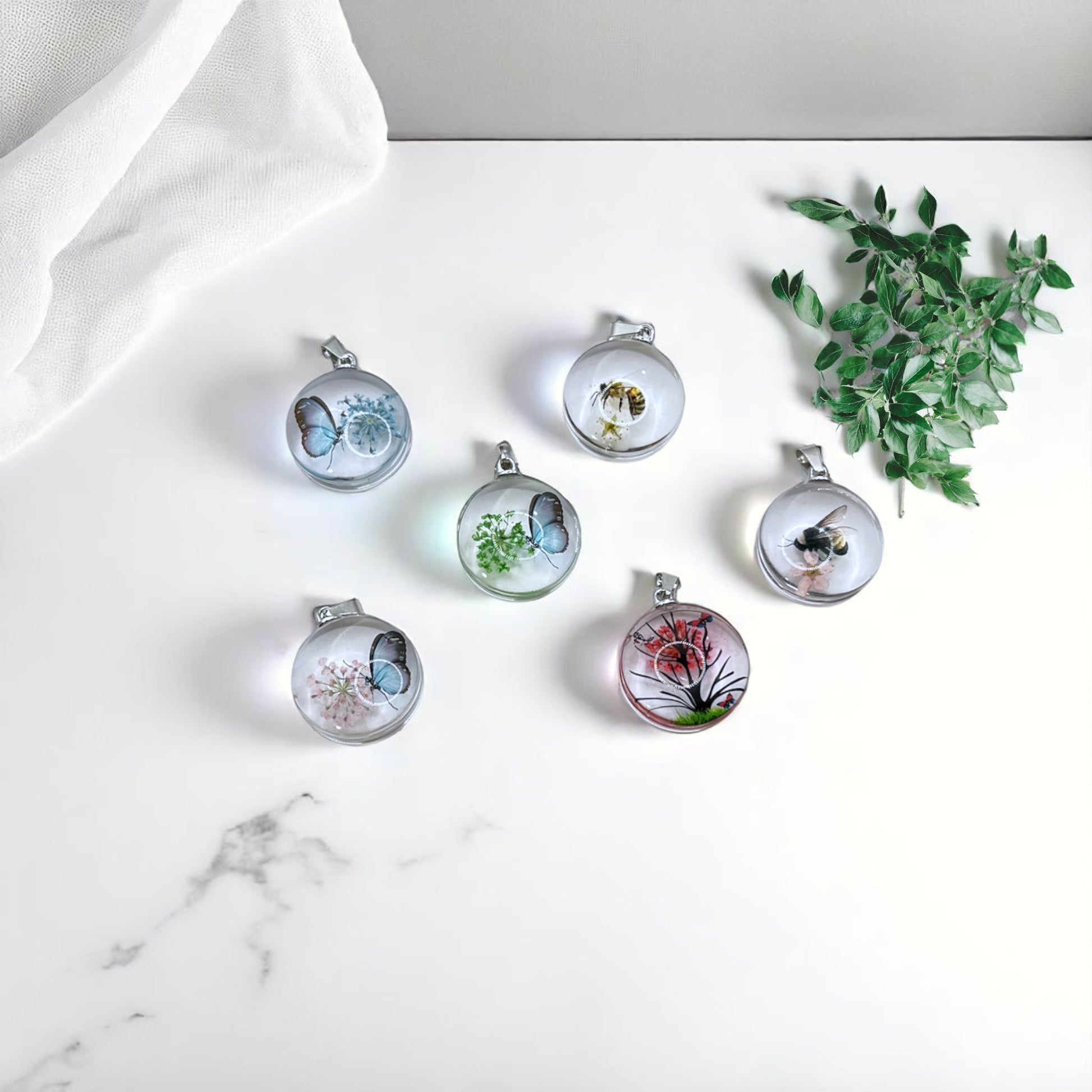 Bring the elegance of nature into your jewelry with these handcrafted round resin pendants, featuring real dried flowers and delicate butterfly accents. Each piece is a tiny world of its own—encased in crystal-clear resin that preserves the intricate beauty of botanical elements in perfect detail.