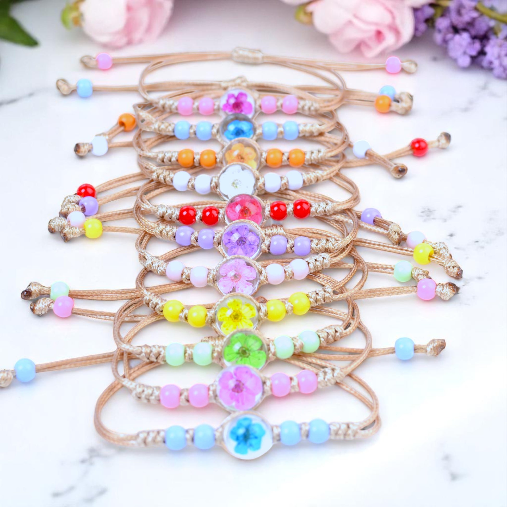Perfect for everyday wear, gifting, or as party favors! These bracelets bring a pop of color and a unique floral accent to any outfit.