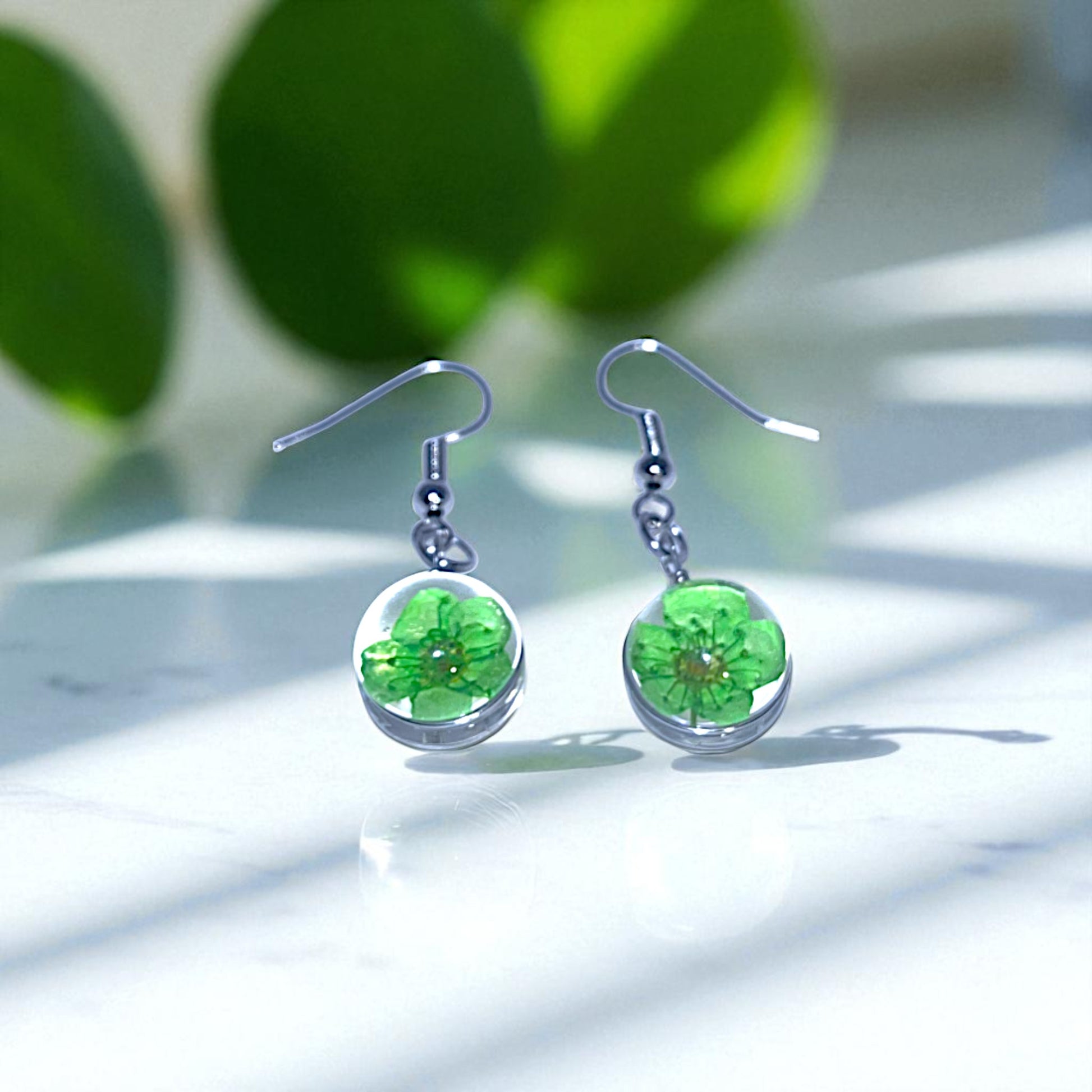 Add a fresh touch of nature to your style with these handcrafted pressed flower resin earrings, featuring real flowers delicately encased in crystal-clear resin. Each round pendant (approx. 1.2 cm x 1.2 cm x 1.0 cm) showcases a beautifully preserved bloom, making every pair truly one-of-a-kind. Lightweight and vibrant, these floral dangle earrings are perfect for spring and summer wear, adding a splash of natural elegance to both casual and dressy outfits.
