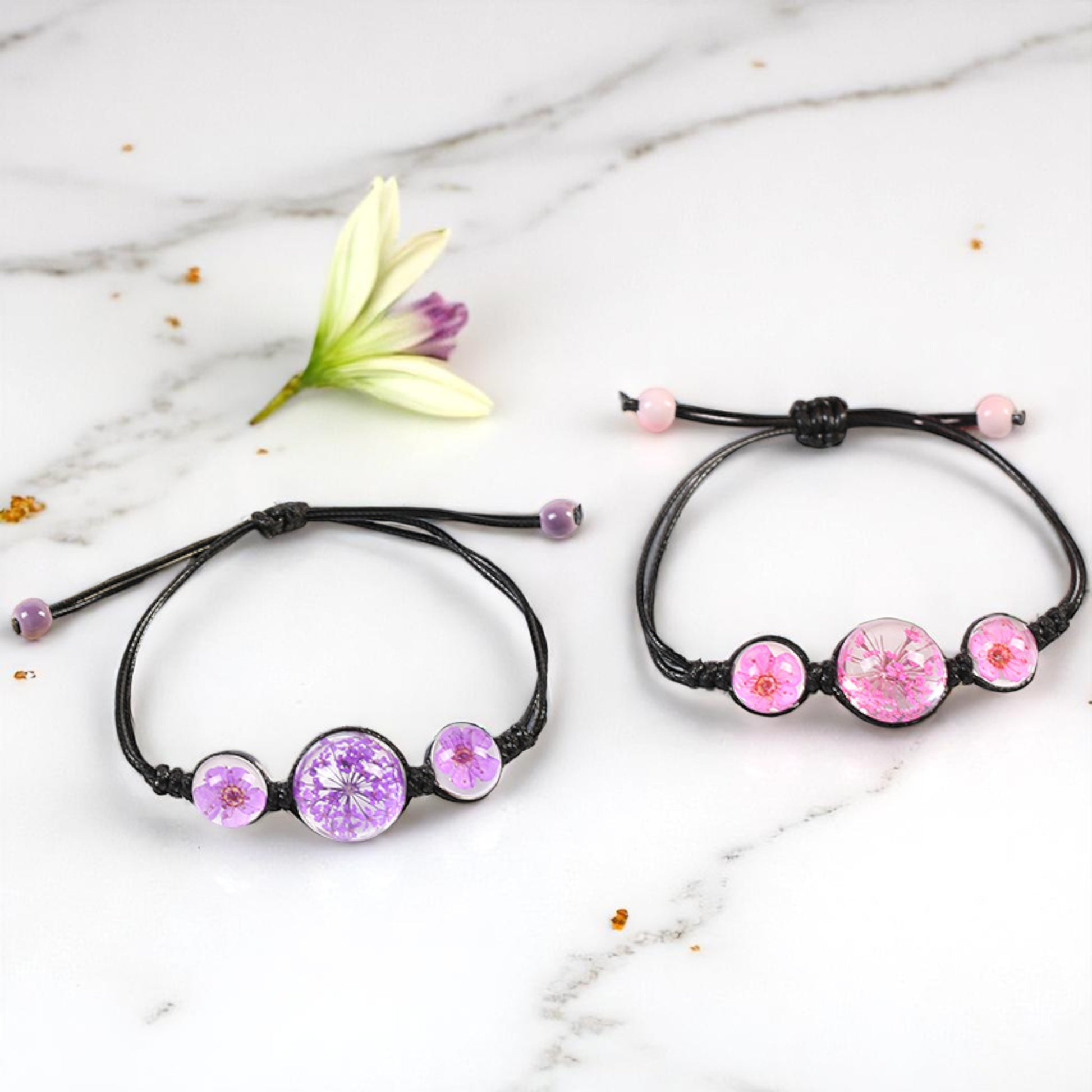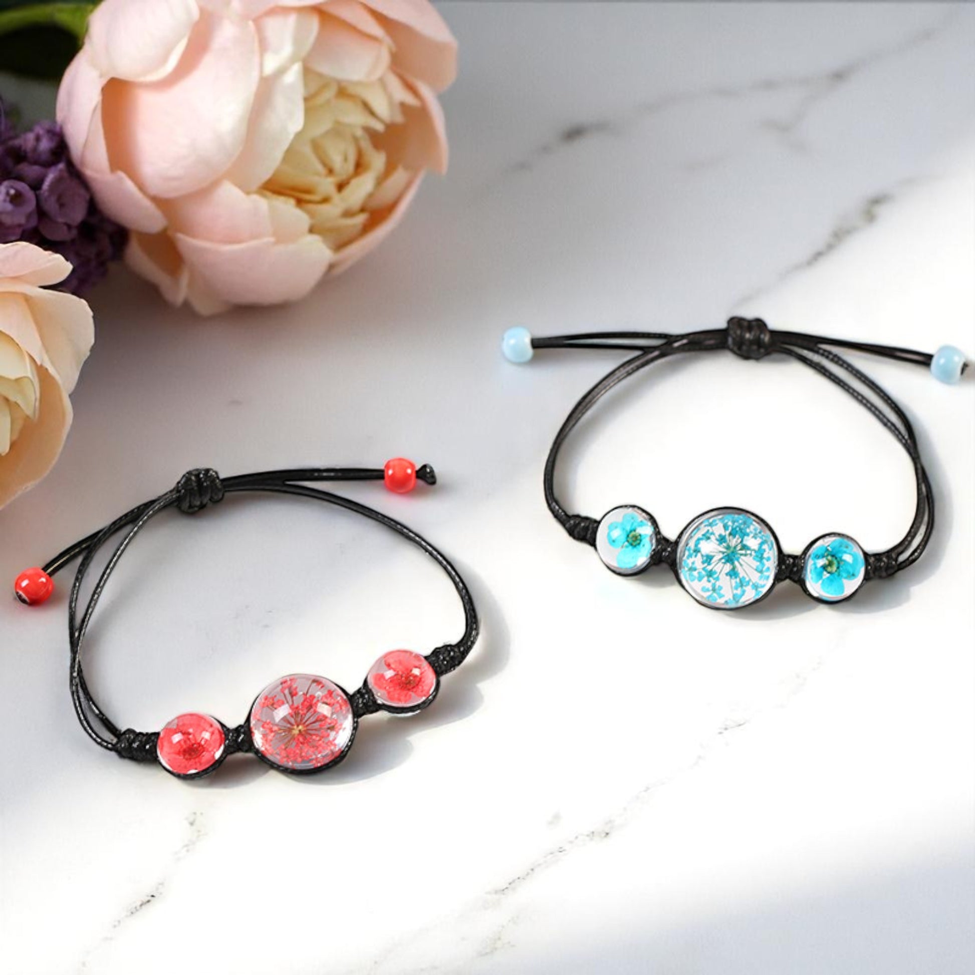 Add a touch of nature-inspired elegance to your style with these beautiful handmade dried flower bracelets. Each bracelet features three resin-encased real dried flowers, showcasing vibrant colors such as blue, pink, purple, red, and green. The bracelets are crafted with durable cords and come with adjustable knots to fit most wrist sizes comfortably. Perfect as a thoughtful gift or a unique accessory to brighten any outfit, these bracelets bring a delicate, artistic charm to your jewelry collection.