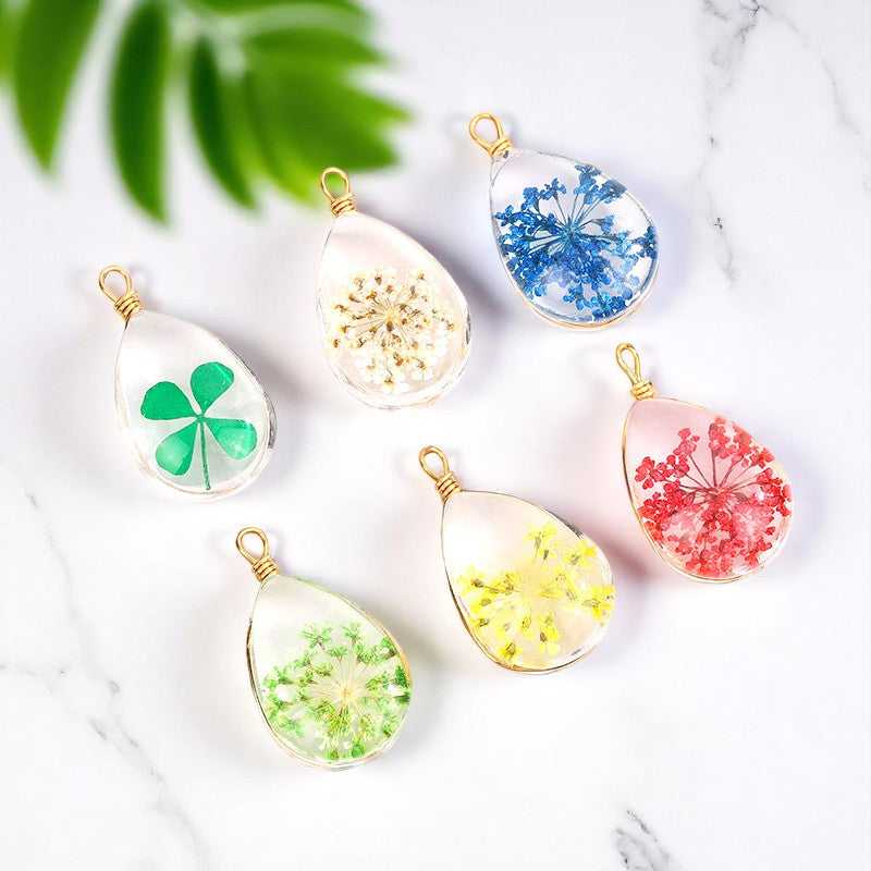 Add a touch of nature to your jewelry collection with these beautifully handcrafted resin teardrop pendants. Each pendant features vibrant, preserved dried flowers encased in clear resin, showcasing their unique shapes and colors. Perfect for creating necklaces. These pendants are lightweight, durable, and come with a gold-tone loop for easy attachment.
