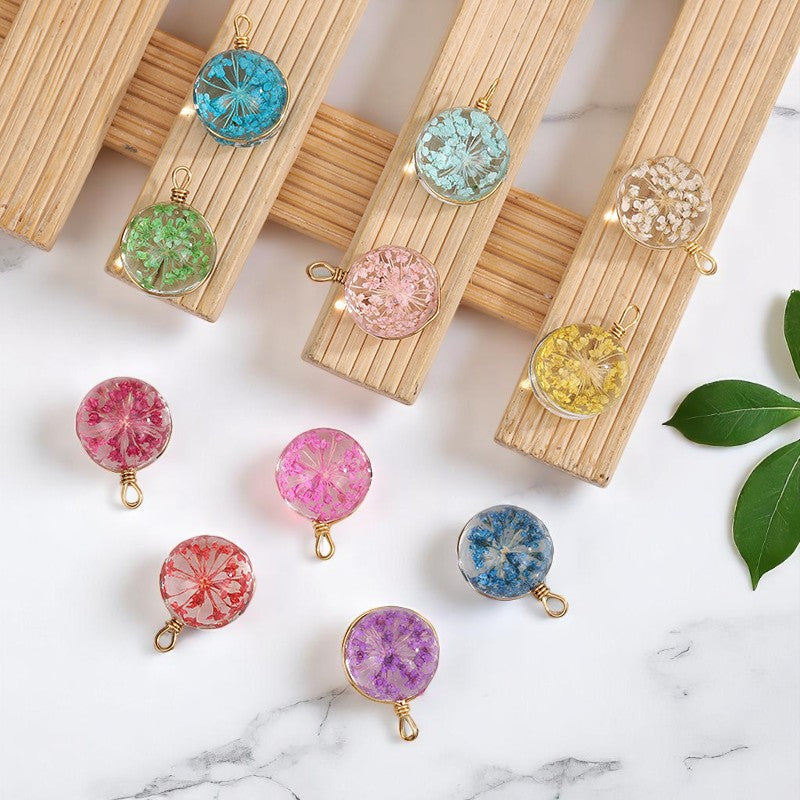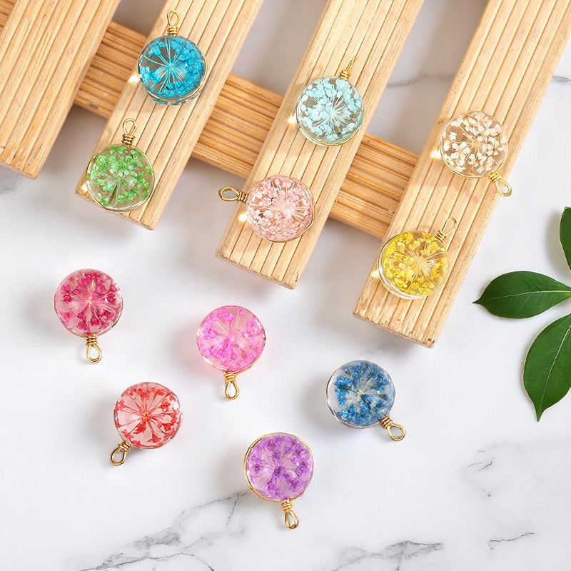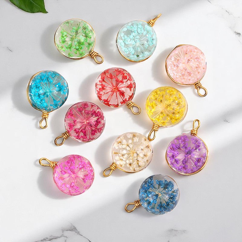 Elevate your jewelry designs with these stunning handmade resin flower pendant charms. Each pendant encapsulates dried flowers in clear resin, showcasing their vibrant colors and intricate details. These pendants are perfect for creating necklaces and are available in an assortment of hues, such as green, red, yellow, purple, blue, and pink. The gold-tone metal loop ensures easy attachment to your craft projects.